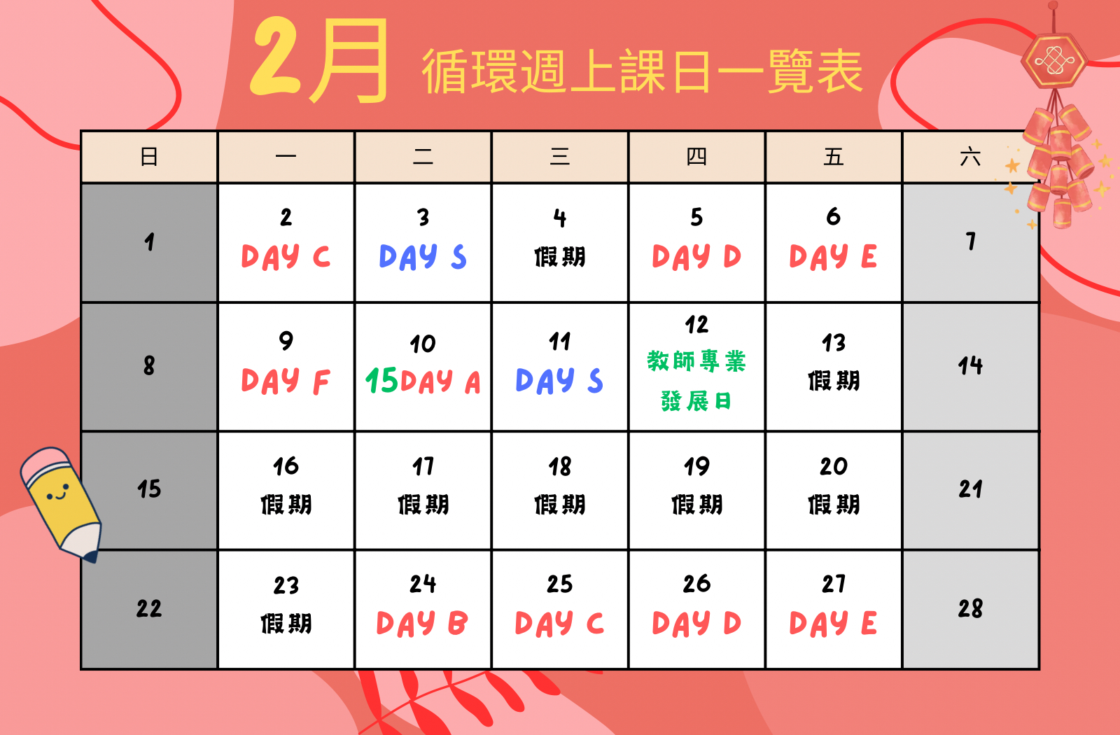 二月循環週上課日一覽表